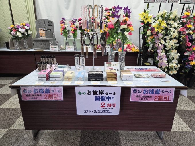 本日より、春のお彼岸セールを開催します!2026年春のお彼岸は春分の日の3月20日を中日として前後3日間がお彼岸の期間ですので、3月17日(火)〜23日(月)までとなります。当社では3月23日まで「春のお彼岸セール」を開催します。仏壇•仏具•線香•ローソク•数珠や小物袋、法要で必要な焼香箱、お香や香炭など、その他各種取り揃えておりますので、ぜひこの機会にご来店くださいませ!お彼岸セール中はゆりの霊園の店舗でも販売させて頂きます。お気軽にお越しくださいませ!